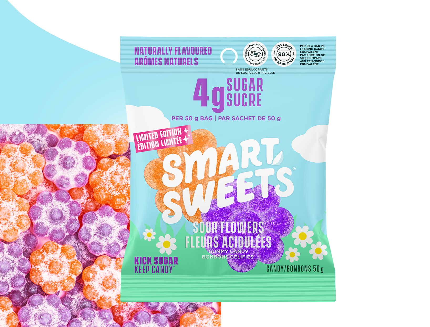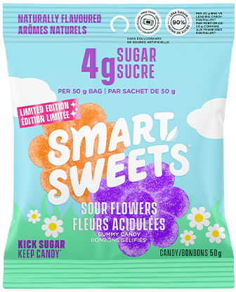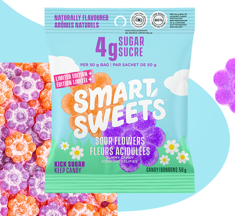 Sour Flowers are in bloom! Bursting with bright, fruity flavor, Sour Flowers come with two juicy flavors per bag: Peach and Purpleberry.